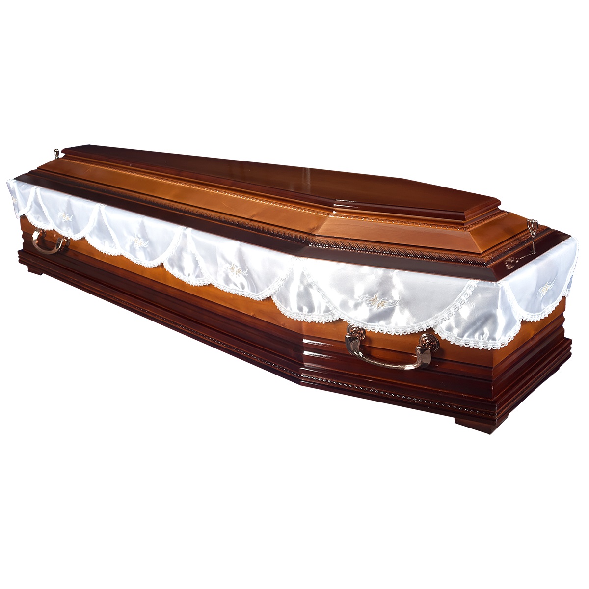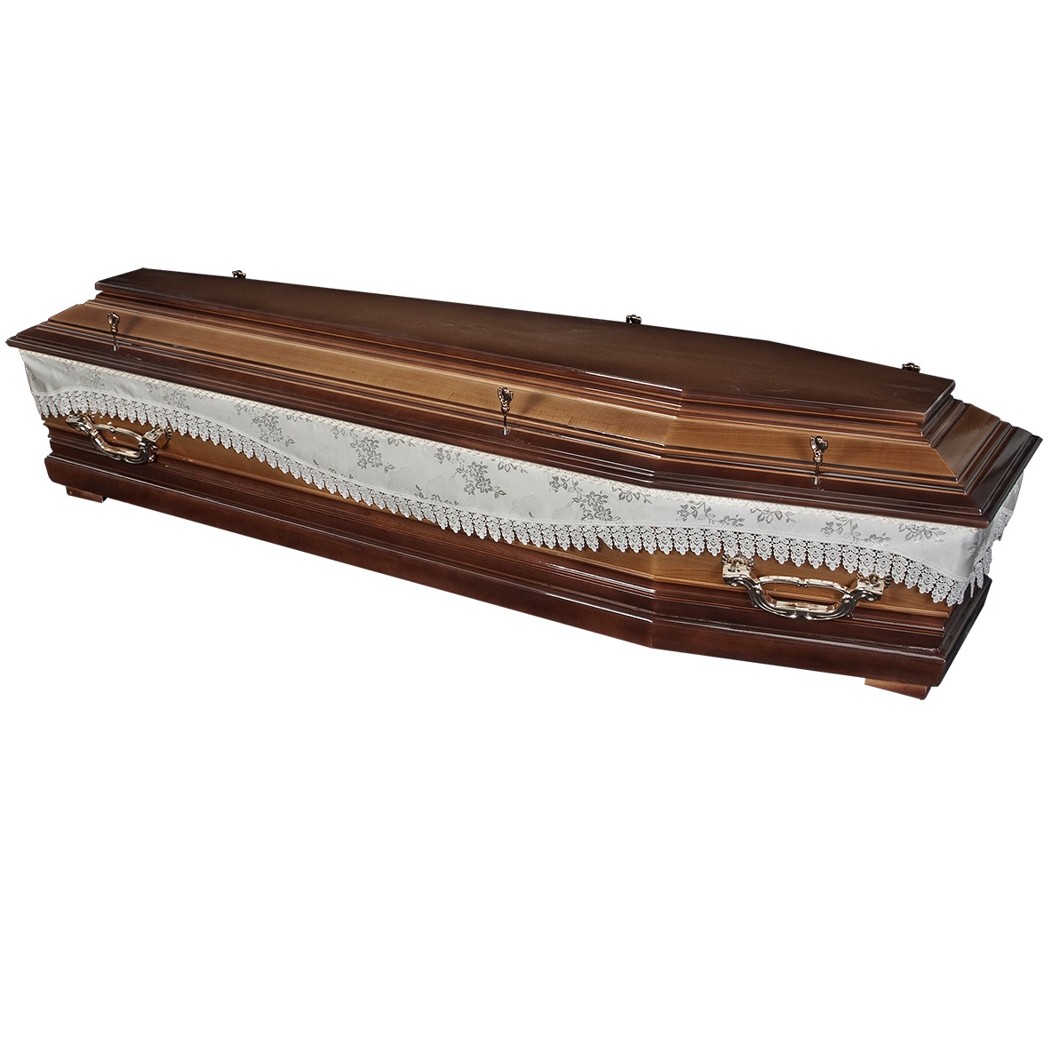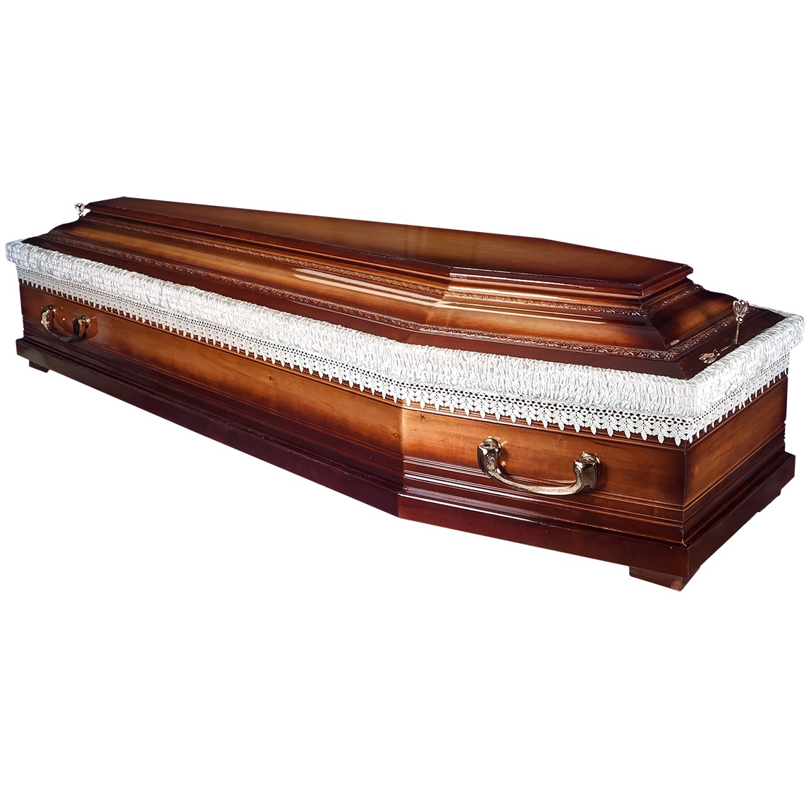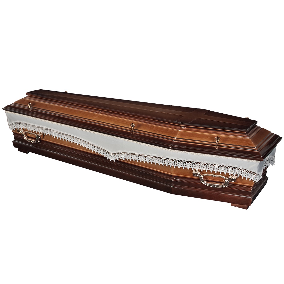 A hatszögletű koporsók a hagyományos temetések klasszikus formavilágát képviselik. Letisztult vonalvezetésük, elegáns arányai és időtálló megjelenésük méltóságteljes búcsút biztosítanak. Kínálatunkban többféle színben és kidolgozással elérhetők, igény szerint választható belső kárpitozással és fogantyúval.