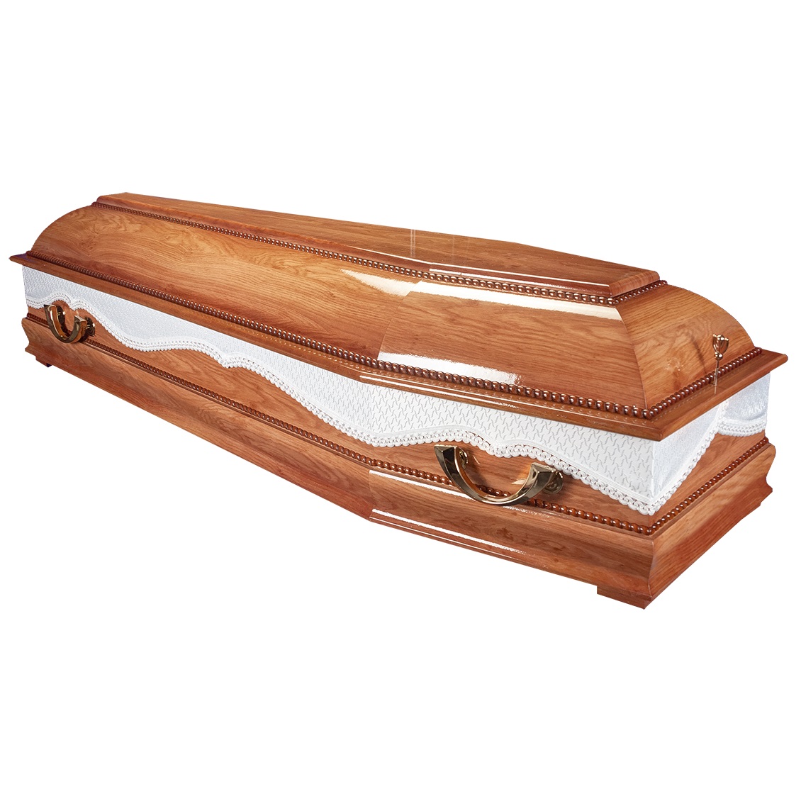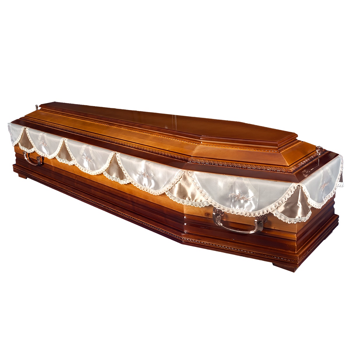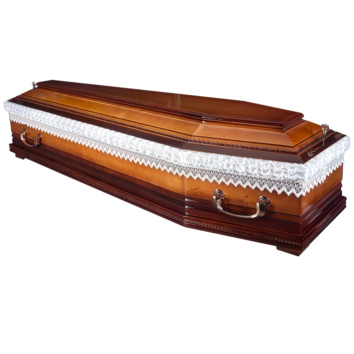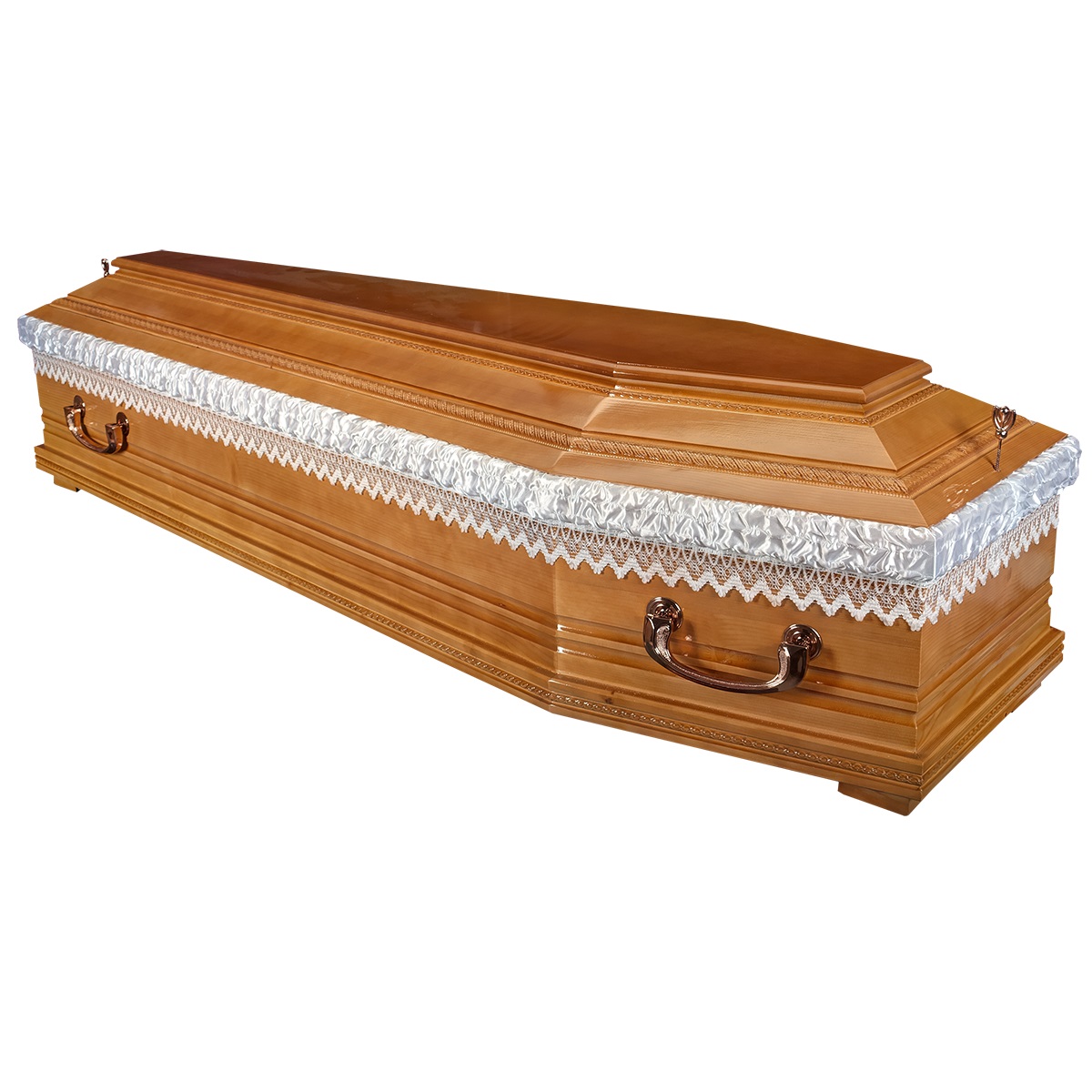 A hatszögletű koporsók a hagyományos temetések klasszikus formavilágát képviselik. Letisztult vonalvezetésük, elegáns arányai és időtálló megjelenésük méltóságteljes búcsút biztosítanak. Kínálatunkban többféle színben és kidolgozással elérhetők, igény szerint választható belső kárpitozással és fogantyúval.